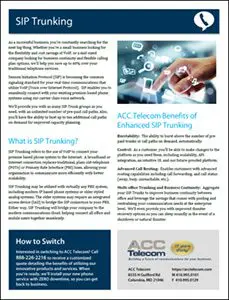 Working with our upstream Carriers, ACC Telecom provides SIP Trunking service to business phone systems and remote employees by utilizing their existing broadband connections.